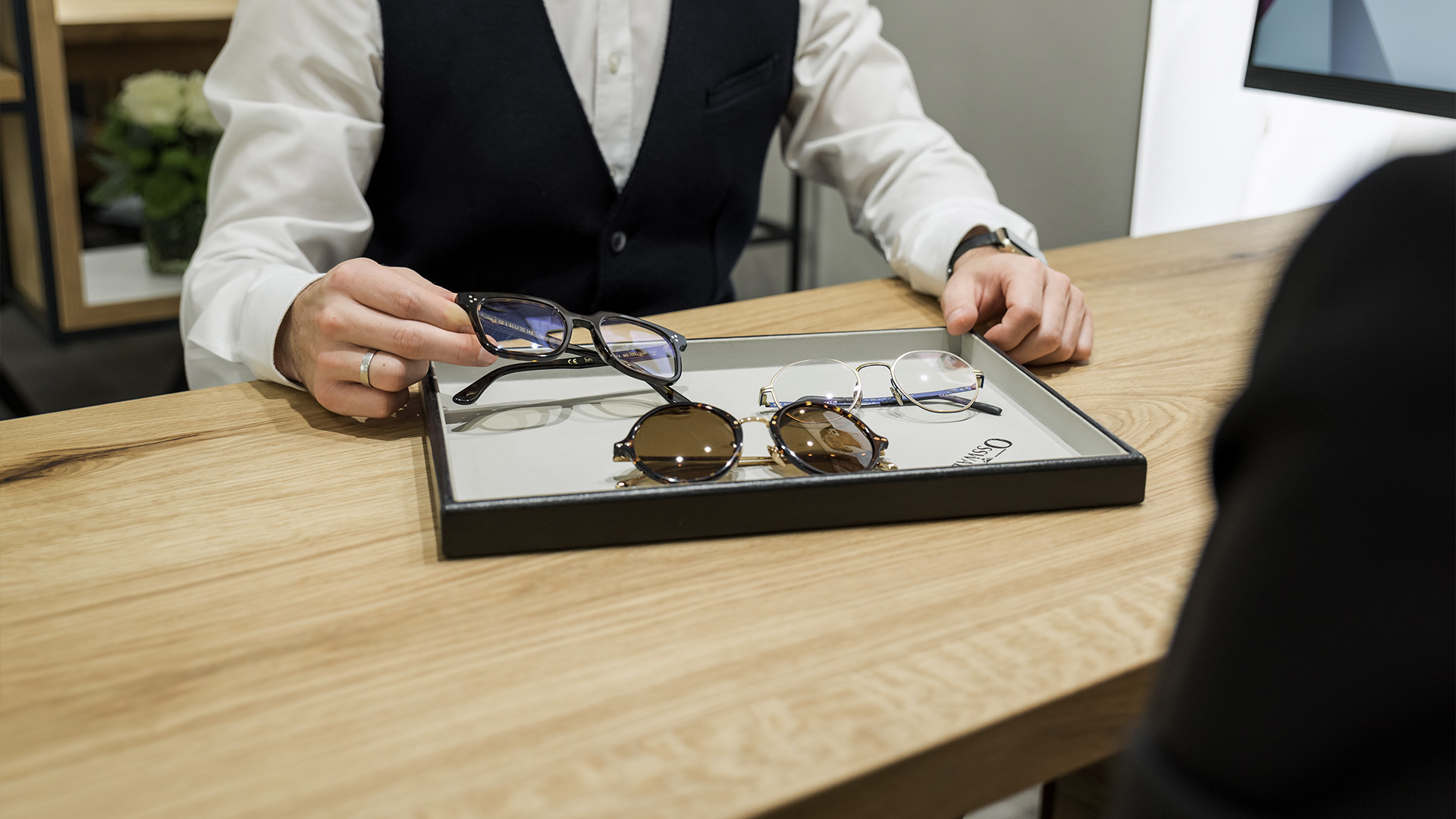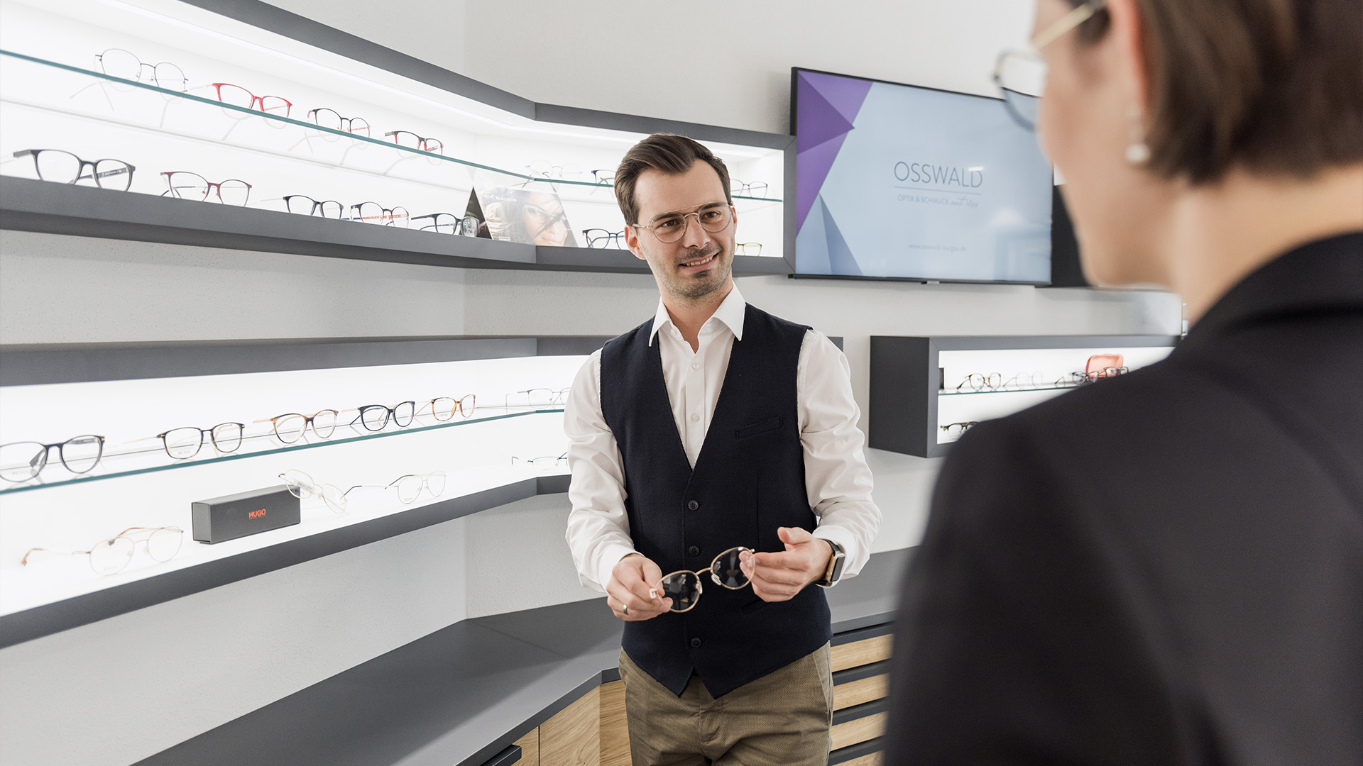 Deswegen können Sie bei Optik & Schmuck Oßwald Ihren neuen Begleiter aus über 800 Fassungen von verschiedenen Herstellern wählen. Neben dem modischen Aspekt beraten wir Sie auch hinsichtlich Passform, Tragekomfort, Stabilität und Material.GlasberatungSCHRITT 06/10Unser Brillenglas-Sortiment umfasst mehrere Qualitätsstufen in unterschiedlichen Preislagen. Um Ihnen die Wahl zu erleichtern, zeigen wir Ihnen die Unterschiede und finden so gemeinsam das richtige Glas für Ihre neue Brille.Anpassung der BrilleSCHRITT 07/10Eine perfekte anatomische Anpassung Ihrer Brille ist besonders wichtig für ein angenehmes Tragegefühl. Um ein Druckgefühl oder Rutschen zu vermeiden passen wir die Brille individuell an Ihre Gesichts- und Kopfform an.Optische AnpassungSCHRITT 08/10Neben der perfekten Anpassung der Brillenfassung ist auch die Positionierung Ihrer Gläser entscheidend. Unter Berücksichtigung Ihrer Augenposition, der Form des Gesichtes und Ihrer ausgewählten Fassung berechnen wir mithilfe moderner 3D- Videovermessung Ihre Zentrierwerte, die ein exaktes Einschleifen und Positionieren Ihrer Gläser ermöglichen. So erhalten Sie maßgeschneiderte Brillengläser.Fertigung der BrilleSCHRITT 09/10Mit höchster Präzision und langjähriger Erfahrung fertigen wir Ihre Brille in unserer hauseigenen Werkstatt. Nach dem 4-Augen-Prinzip wird als zusätzliche Qualitätskontrolle jede fertige Brille nochmals von einem anderen Mitarbeiter überprüft, sodass auch kleinste Unstimmigkeiten entdeckt und beseitigt werden können.Perfektes SehenSCHRITT 10/10Ihre Brille ist abholbereit!